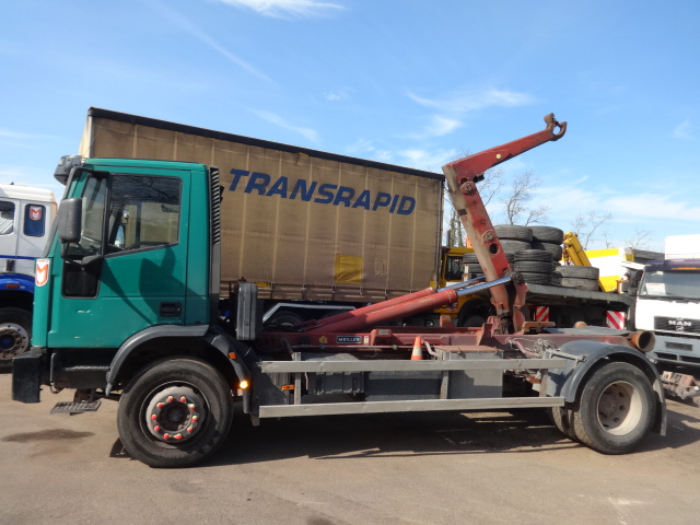 Fahrzeug mit Blattfederung, Meiller Abrollvorrichtung Typ 13,55 Bj 2000, voll fahrbereit, Bereifung 315/70R22,5 Profil 40%, Radstand 4600mm.